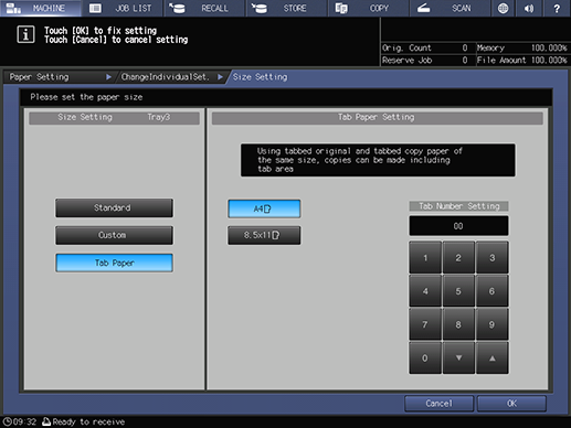 Set the standard size or custom size for paper or paper profile, or the paper size for tab paper.