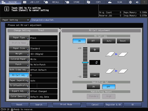 [Humidifying Amount] | Set the amount of humidification for the humidification curl adjustment. Set this value to suit the paper type or paper curl degree. Using coated paper allows you to increase the amount of humidification to suit the characteristics, etc. |