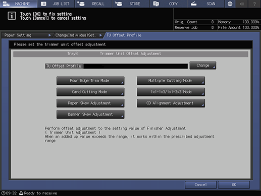 [1e1-1e3/1e1-3e3 Mode] | Arbitrarily adjusts the trim position, crease position, and perforation position. For details about [1e1-1e3/1e1-3e3 Mode] settings, refer to [1x1-1x3/1x1-3x3 Mode] of [Adjustment]. |