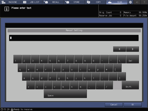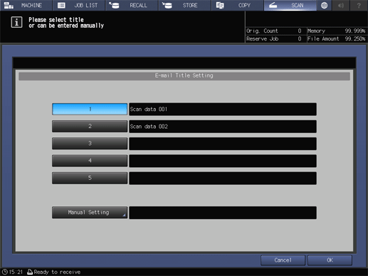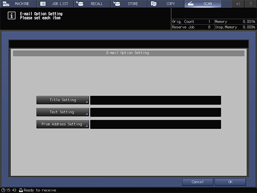 Set the title or text of the email to be sent, as well as the sender's email address. This function is displayed when [E-mail] is selected.