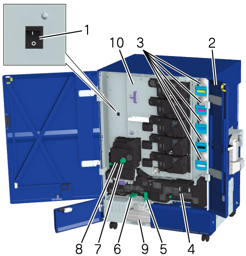 1 | Main power switch | The customer engineer switches OFF/ON. Do not turn off under normal circumstances. |