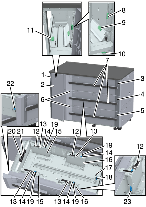 6 | Air nozzle confirmation window | When adjusting the air level in the Middle tray or Lower tray, you can check the paper feedability through this window. You cannot check it from the Upper tray. |