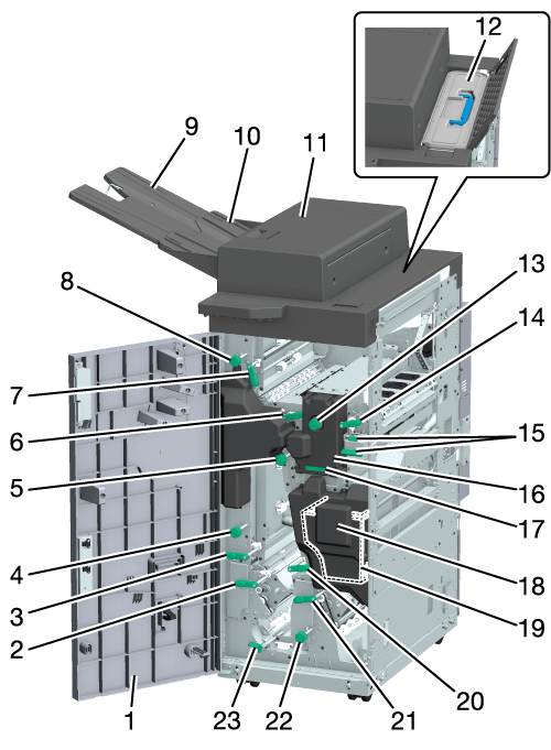 23 | Lever [RU11] | When clearing a paper jam, hold the lever, open the guide, and remove the paper. |