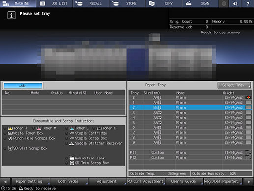 The remaining amount of paper in each paper tray is displayed on the [MACHINE] screen.