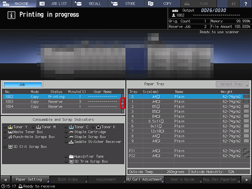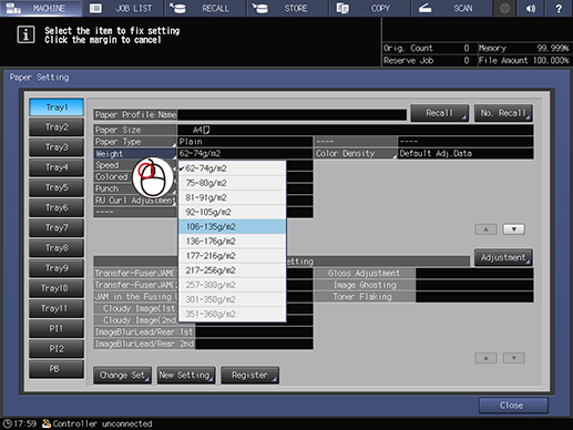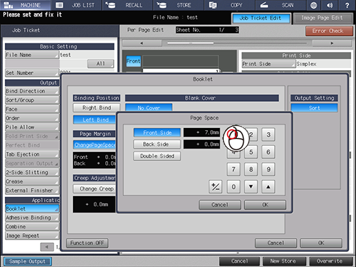Press [Booklet] in [Application Setting] and then press [ChangePageSpace]. Rotate the wheel upward to count up.