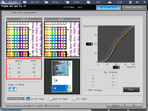 If you place the cursor anywhere in the image before or after making the adjustments, the CMYK value for before or after the adjustments should be shown.