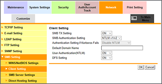 [SMB Authentication Setting] | [NTLM v1] | Sets the SMB authentication method. Select from the menu list. |