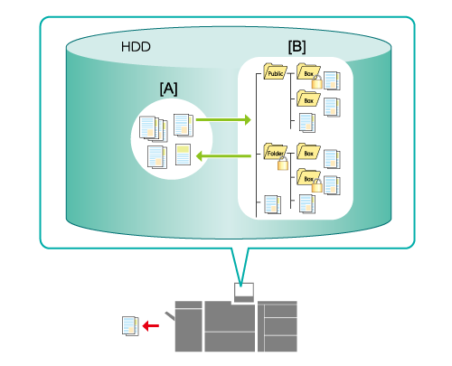 HDD store jobs: Can be printed, and sent to a computer over a network. HDD store jobs can also be recalled as hold jobs. The jobs are stored in folders or boxes created on the machine's HDD. For details about HDD store jobs, refer to [RECALL].