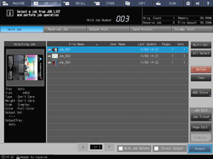 You can use [JOB LIST] or [RECALL] on the Touch panel to print or edit those jobs or store those jobs by creating folders or boxes on the machine’s HDD. You can perform detailed management of jobs.