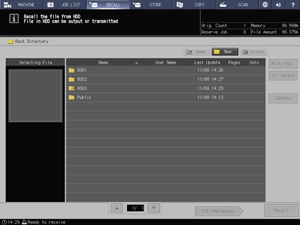 [RECALL] screen | Displays HDD store jobs. You can create boxes and folders on the machine's HDD. You can also recall stored jobs as hold jobs. |