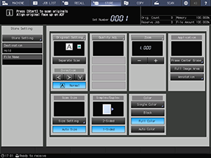 [STORE] screen | Configure settings so that the data scanned using the ADF or Original glass (scan jobs) are stored as hold jobs or HDD store jobs. You can create boxes and folders on the machine's HDD. |