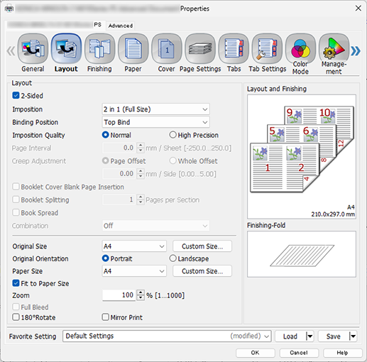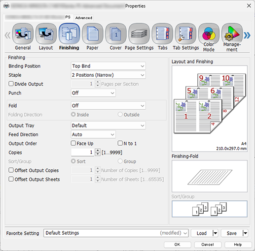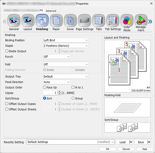 For details about the settings, refer to the [Finishing] tab settings (described after the procedure).