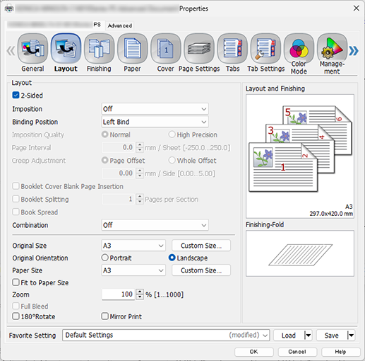 This section describes the procedure for making 2-sided prints of A3-sized 1-sided originals onto A3-sized paper with a Z-fold finish using the PS Plug-in Driver.