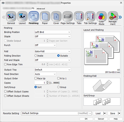 For details about the settings, refer to the [Finishing] tab settings (described after the procedure).
