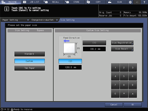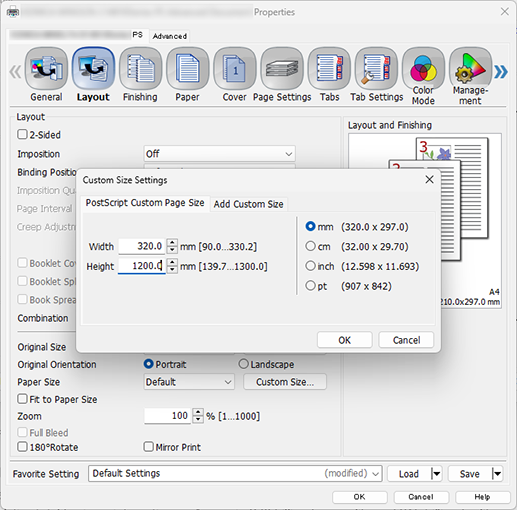 Select [Custom] and set the paper size ((Width) 330.2 mm e (Length) 1,200.0 mm / (Width) 13.0" e (Length) 47.24" is used here).