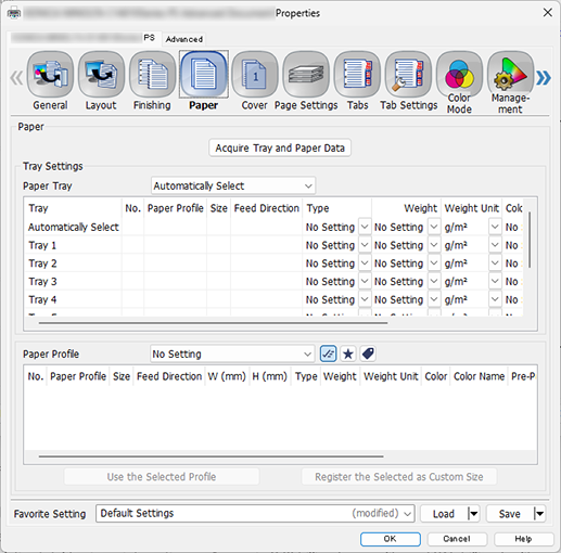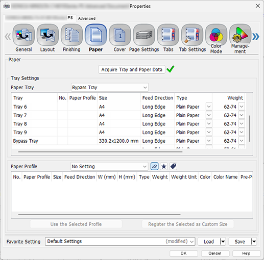 Select the [Paper] tab, and click [Acquire Tray and Paper Data].