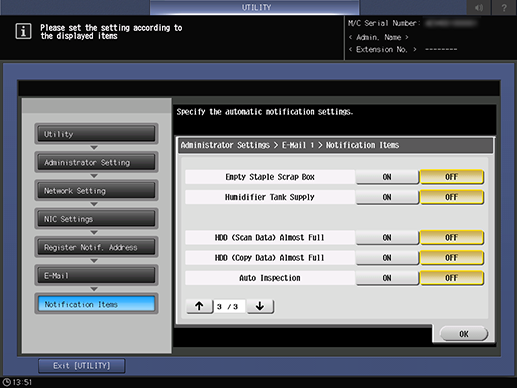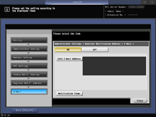 Set the email address to send the notifications to and the [Notification Items] ([Auto Inspection] in this case) by accessing, in order, Control panel, Utility/Counter, [Administrator Setting], [Network Setting], [NIC Settings], [Detail Settings], [Status Notification Setting], [Register Notification Address], [E-mail 1] to [E-mail 5], and then [ON].