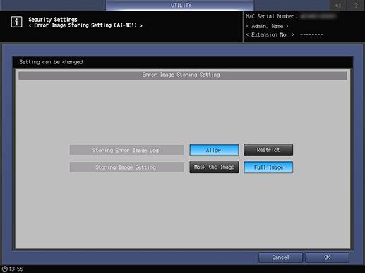 Configure the settings by accessing Control panel, Utility/Counter, [Administrator Setting], [Security Setting], and then [ErrorImageStoringSet(AI-101)].