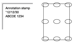 [Annotation] | Call the text strings which have been combined and registered in advance as an [Annotation], the time and date at which the original is scanned, the sequence numbers settings of originals, and print them at the specified position on the copy image. Printing example: [Annotation] setting example - [Text]: Annotation stamp [Date/Time]: '12/12/30 [Annotation No.]: ABCDE 1234 ![]() |
