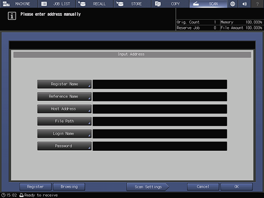 You can register up to 150 SMB destinations. For details about registering a destination, refer to [Scan Address Register].