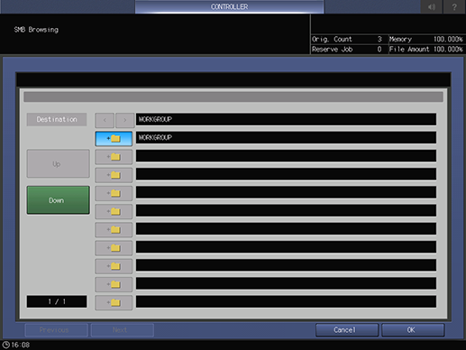 You can select destinations by pressing the register name from the destination list. For details about selecting a registered destination, refer to Sending to a Registered SMB Server.