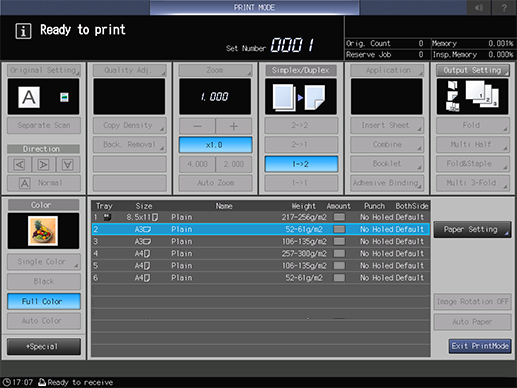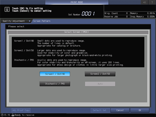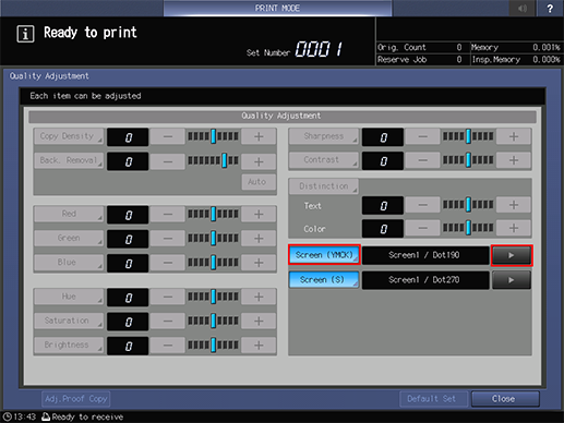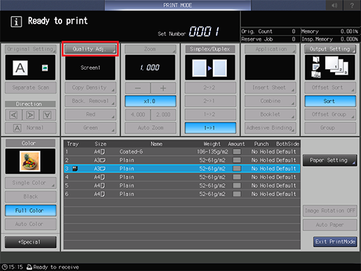 When there is no space in the registration frame | Overwrites and registers the one that meets the following conditions. If more than one condition applies, the smallest number will be overwritten with priority. (1) Same screen + same paper type + same weight and adjustment value with an old date (2) Same screen + same paper type and adjustment value with an old date (3) Same screen and adjustment value with an old date (4) Adjustment value with oldest date However, if the adjustment value that is about to be overwritten is the only one among the registered screens, it will be registered and overwritten to the oldest dated adjustment value on another screen without overwriting. |