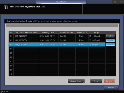 Select [No] to display the list of density balance adjustment values. Press [Return] to return to the [Density Balance Auto. Adjustment] screen.