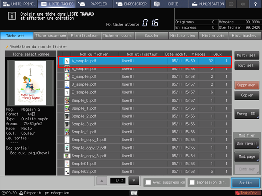Pour des détails sur les fonctions de modification de tâches de l'écran [LISTE TÂCHES], voir Modifier une tâche en attente.
