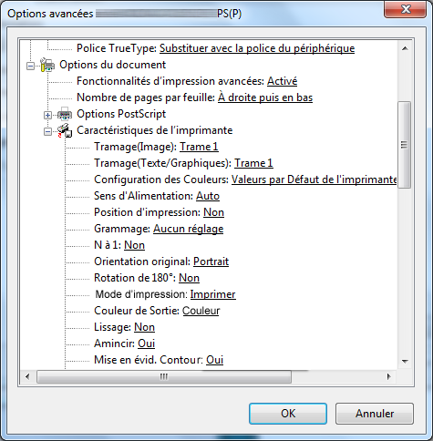 [Options PostScript] | [Optimiser la vitesse], [Optimiser la portabilité], [PostScript encapsulé (EPS)], [Format d'archive] | Définissez une option de sortie pour PostScript. Pour en savoir plus, voir le guide PostScript. |