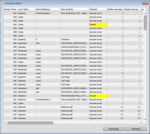 Vous pouvez afficher l'écran [Historique tâches] en cliquant sur [Historique tâches] sur l'écran [Job Centro]. L'historique des tâches peut être enregistré dans un fichier au format CSV (administrateur uniquement).