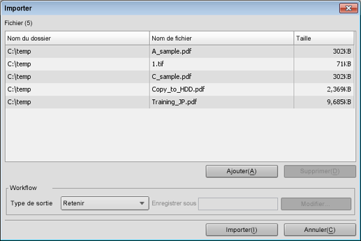 Pour en savoir plus sur l'écran [Import (PDF/VT-2)], voir Écran Importer (PDF/VT-2).