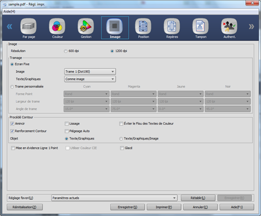 Les éléments de réglage sont ici les mêmes que ceux de l'écran « Image » du pilote Plug-in PS à l'exception de [PDF RIP]. Pour une description des éléments de configuration commune, voir Image.