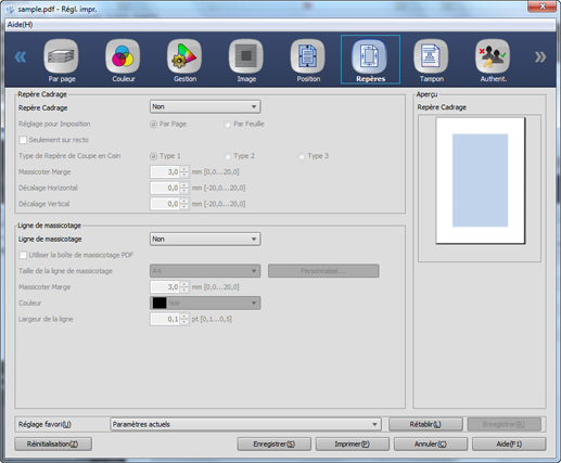 Vous pouvez définir le repère de cadrage du réglage d'impression.