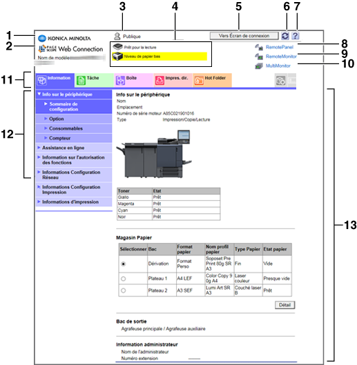 Après la connexion à PageScope Web Connection, l'écran qui s'affiche est comme celui illustré ci-dessous. L'écran suivant est un exemple d'écran affiché lorsque [Info sur le périphérique] est sélectionne sous l'onglet [Information].