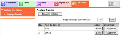 [Réglage Dossier] | Permet de créer de nouveaux dossiers hot folder et de modifier ou supprimer les dossiers hot folder créés. |