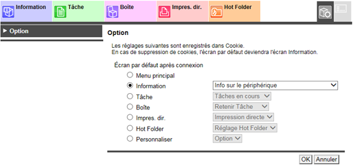 [Information] | Affiche l'onglet [Information] après la connexion. Vous pouvez sélectionner quel écran de l'onglet [Information] vous souhaitez afficher. |