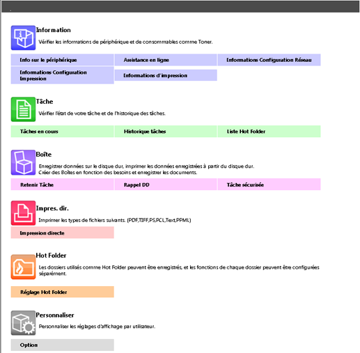 Lorsque le menu principal est affiché, tous les articles de menu utilisables en mode utilisateur sont regroupés en un seul écran.