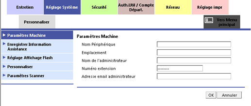[Paramètres Machine] | Cet écran vous permet d'entrer le nom du périphérique, l'emplacement et l'information administrateur. Pour en savoir plus, voir Configuration Machine. |