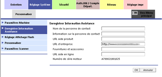 Pour afficher cet écran, cliquez sur [Enregistrer Information Assistance] dans le menu de l'onglet [Configuration système].