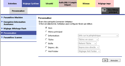 Selon votre environnement de travail au bureau, spécifiez un écran de démarrage approprié en vue d'optimiser l'efficacité de l'utilisateur. Par exemple, si vous utilisez fréquemment la fonction Impression directe sur la machine, vous pouvez spécifier[Impres. dir.] comme écran initial.