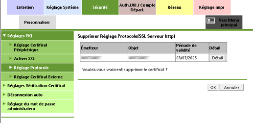Cliquez sur [Supprimer] pour un protocole dont vous souhaitez supprimer le certificat.