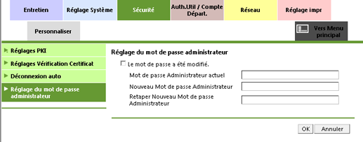 Cliquez sur [Réglage du mot de passe administrateur] dans le menu de l'onglet [Sécurité] pour afficher cet écran.