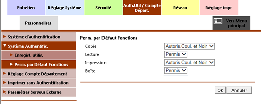 Pour afficher cet écran, cliquez sur [Système Authentific.] - [Perm. par Défaut Fonctions] dans le menu de l'onglet [Auth.Util / Compte Départ.]. Ce réglage est disponible uniquement si vous réglez l'[Authentification utilisateur] sur [Oui (serveur externe)].