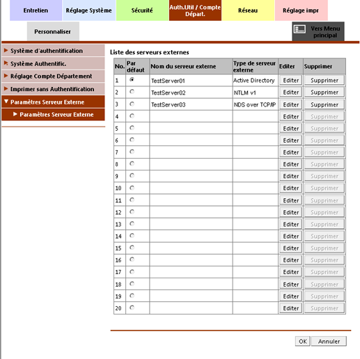Vous pouvez afficher la liste des serveurs d'authentification externes actuellement enregistrés. La case d'option [Par défaut] du serveur par défaut est cochée.