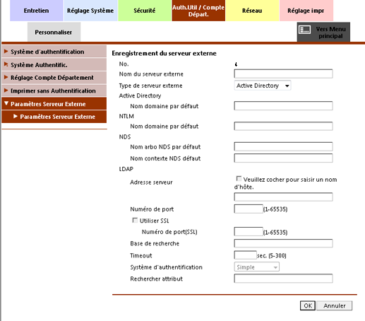 Pour afficher cet écran, cliquez sur [Paramètres Serveur Externe] - [Paramètres Serveur Externe] dans le menu de l'onglet [Auth.Util / Compte Départ.].