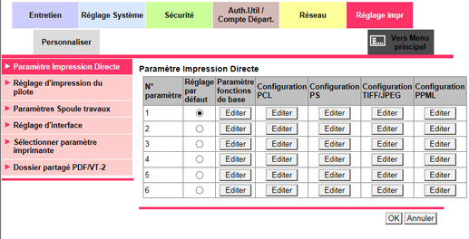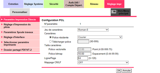 [Configuration PCL] | Effectue les réglages d'impression PCL. Pour en savoir plus, voir Configuration PCL. |
