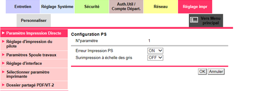 Sélectionnez [ON] ou [OFF] dans la liste déroulante [Erreur Impression PS] et sélectionnez [ON] ou [OFF] dans la liste déroulante [Surimpression à échelle des gris].