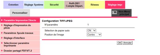 [Configuration TIFF/JPEG] | Effectue les réglages d'impression TIFF/JPEG. Pour en savoir plus, voir Configuration TIFF/JPEG. |