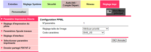[Configuration PPML] | Effectue les réglages d'impression PPML. Pour en savoir plus, voir Réglage PPML. |