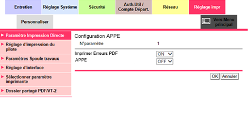 [Configuration APPE] | Effectue les réglages d'impression APPE. Pour en savoir plus, voir Configuration APPE. |